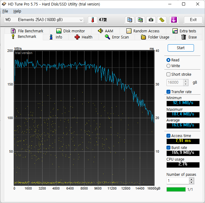 애용하진 않지만 앞으로 HDD를 살 일은 없다고 생각하니 기왕 산거 속도 그래프를 구경하기 위해 HD Tune Pro를 사용해 R/W 벤치마크를 수행했다.