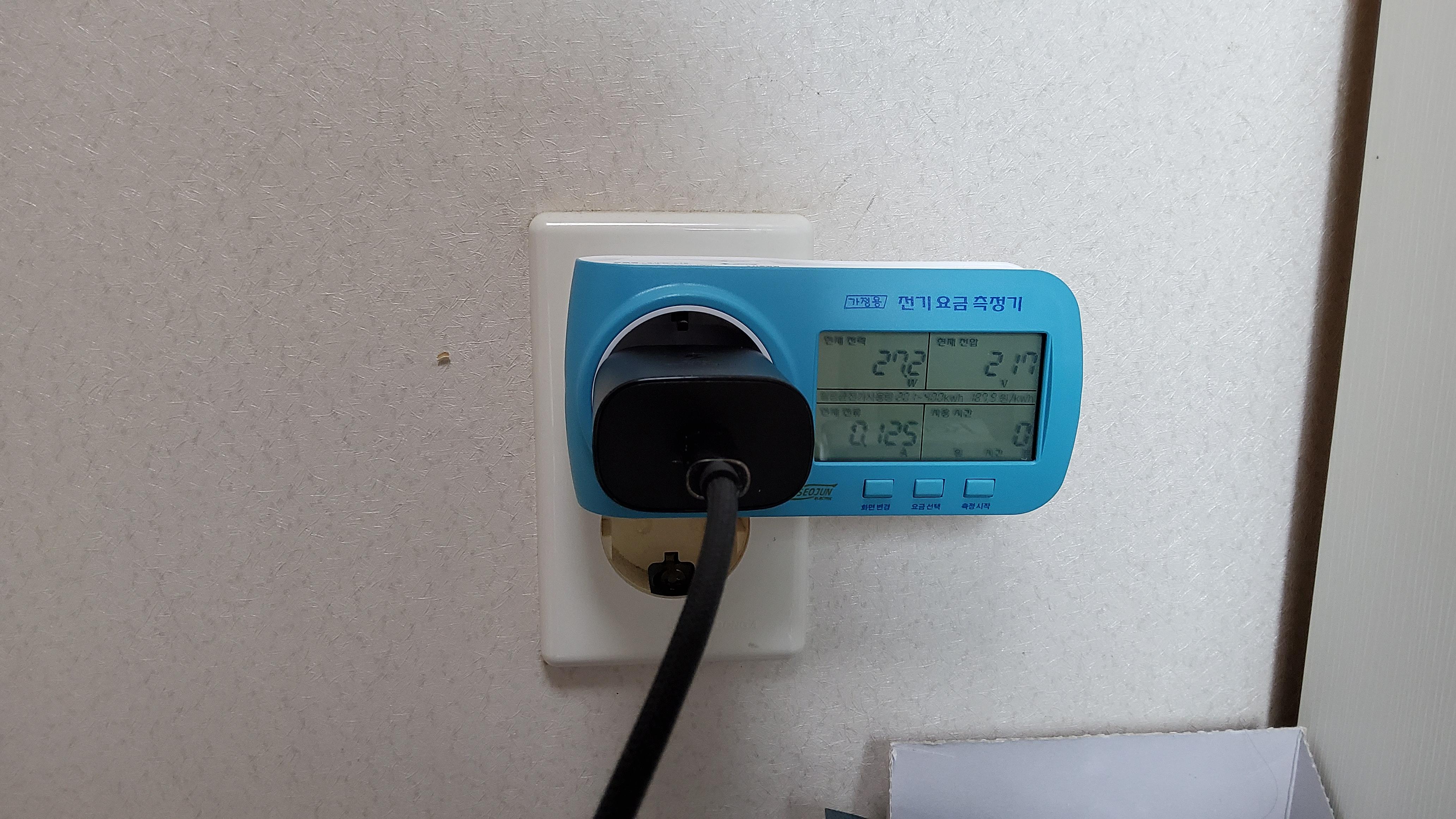 전원을 끈 상태에서는 약 0.2W, 전원을 켜고 대기상태일 때는 약 1W를 소비하는 것을 알 수 있다.